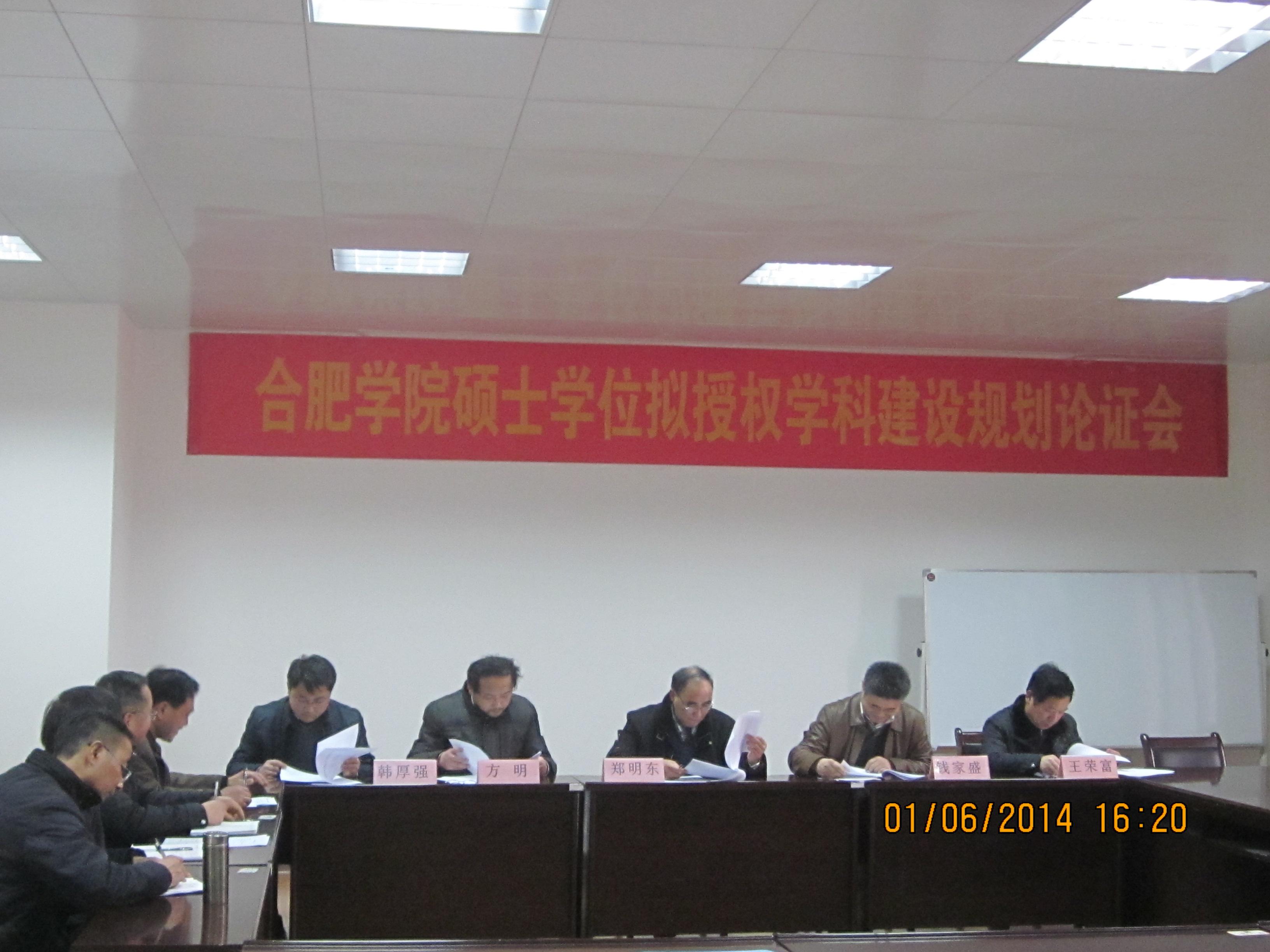 2014年1月6日下午,由安徽大學化學化工學院錢家盛教授、安徽農業大學實驗中心王榮富教授、安徽工業大學學科建設辦公室鄭明東教授、安徽眾銳質量檢測有限公司高工方明、安徽南風環境工程技術有限公司高工韓厚強組成的專家組在化學與材料工程系會議室對我院獲得省級擬授權碩士學位學科“化學工程與技術”的建設規劃進行了論證。