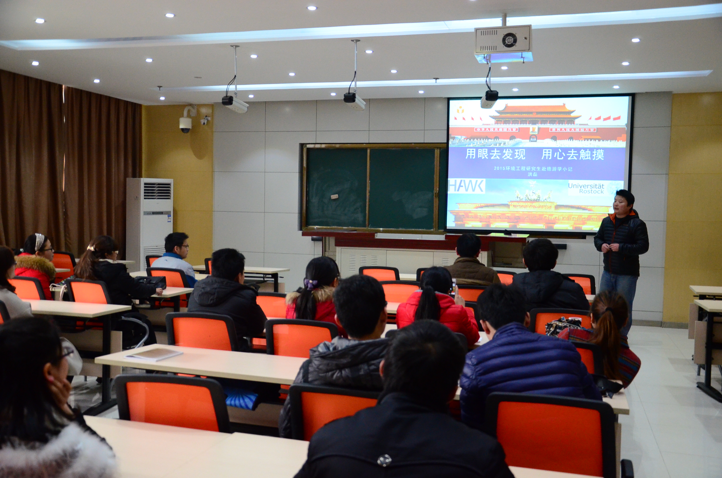 交流報告會上,游學指導教師王磊、洪磊、張金流分別介紹了帶隊赴韓國、德國以及在省內(nèi)游學的情況。部分參加游學的學生也通過照片、視頻等方式與大家分享了他們精彩紛呈的游學之旅,并講述了他們參加此次游學的感悟和收獲。據(jù)了解,2014年,我校共有8名研究生赴韓國湖西大學、天安市環(huán)境能源事務所、韓國電子產(chǎn)業(yè)環(huán)境協(xié)會、現(xiàn)代汽車公司(牙山工廠)污水處理廠參觀游學。5名研究生赴德國哥廷根應用科學大學、羅斯托克大學、施特拉松德應用科學大學、云德生物能源村、弗勞恩霍夫研究院等游學。在省內(nèi)游學的同學則赴青陽、滁州、蚌埠等地參觀調(diào)研了相關的環(huán)保企業(yè)。