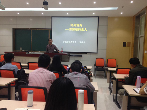 2015513日上午10時,合肥學院大學生成長與發展指導中心主任、安徽省心理學會常務理事、中國筆跡分析學會秘書長張福全教授為同學們作了一場題為“提高情商——做情緒的主人”的講座。張教授主要從“什么是情緒”、“什么是情商”和“如何提高情商及控制個人情緒”三個方面為同學們作了精彩的闡述。張教授用生動的語言、原創的案例和富有哲理的比喻對心理學、心理健康的有關問題進行了精彩的解讀和闡釋,面對心理壓力,他提出自我調控技巧六法:音樂放松、運動放松、體閑放松、冥想放松、催眠放松等,積極倡導過體現生命價值的有趣、有愛、有希望的生活。