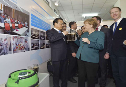李克強總理與默克爾總理在合肥學院食品專業交流合作展區共同品嘗我校學生釀制的德國黑啤。