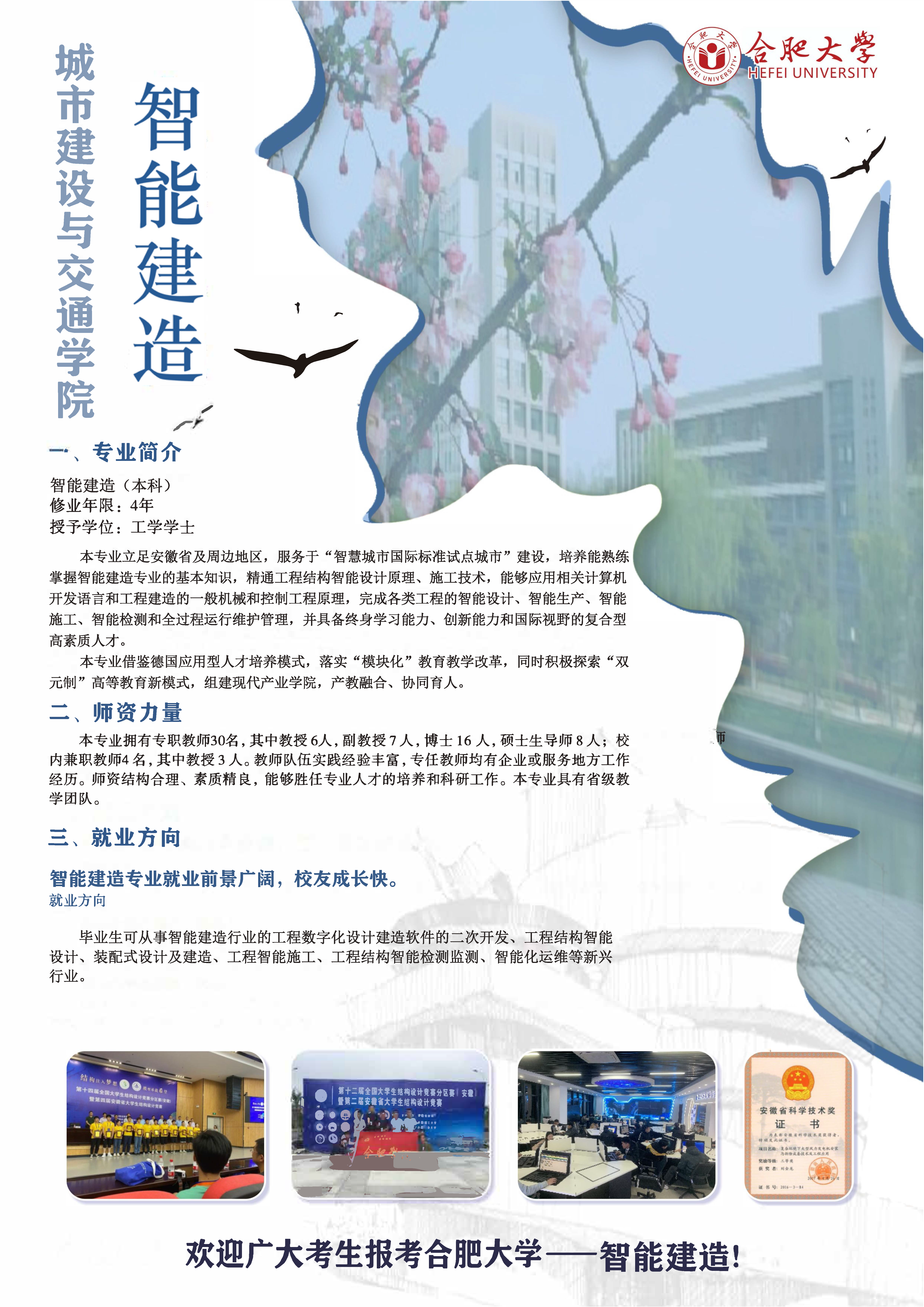 培養目標及特色:本專業立足安徽省及周邊地區,服務于“智慧城市國際標準試點城市”建設,培養能熟練掌握智能建造專業的基本知識,精通工程結構智能設計原理、施工技術,能夠應用相關計算機開發語言和工程建造的一般機械和控制工程原理,完成各類工程的智能設計、智能生產、智能施工、智能檢測和全過程運行維護管理,并具備終身學習能力、創新能力和國際視野的復合型高素質人才。本專業借鑒德國應用型人才培養模式,落實“模塊化”教育教學改革,同時積極探索“雙元制”高等教育新模式,組建現代產業學院,產教融合、協同育人。