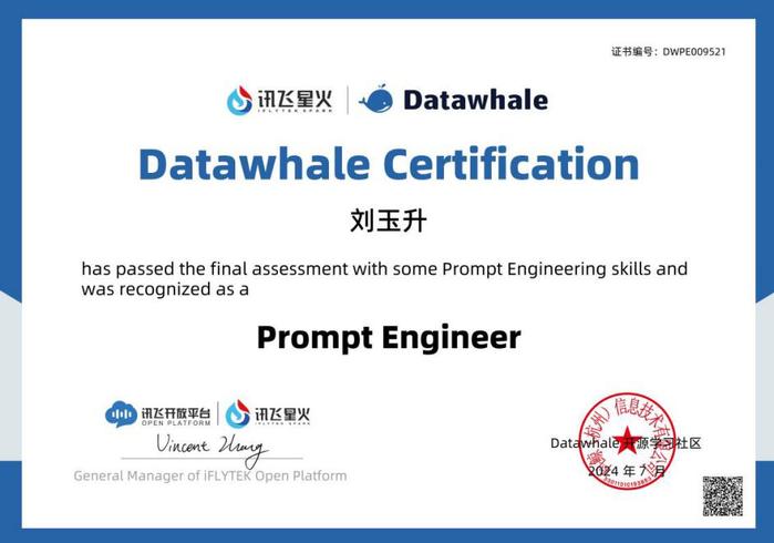 2024年6月至9月,在導師推薦下,劉玉升通過選拔進入科大訊飛股份有限公司訊飛數碼研究院實習,深度參與了訊飛星火大模型的研發工作,主要負責Prompt工程優化任務。憑借扎實的專業基礎和出色的工程能力,他系統性地完成了各類任務的整編工作,通過深入分析客戶需求,制定了差異化的Prompt優化策略。在數據處理層面,他運用Python對訓練數據進行清洗與統計分析,成功構建了包含10萬余條的高質量SFT數據,覆蓋33個具體任務場景。此外,他還參與了大模型效果的評測工作,為后續模型的迭代優化提供了支持。