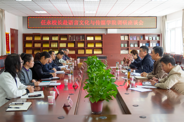 任永在認真聽取匯報后,對語言文化與傳媒學院近年來取得的成績給予肯定,對學院發展的關鍵問題和重點任務進行了指導。他強調,語言文化與傳媒學院一是要聚焦文傳特色,充分發揮自身專業優勢,在助力學校融媒體發展和培育學生人文素養上積極作為;二是要聯動省內兄弟高校,整合資源,強化人文學科建設和科研工作跨校合作力度,推動形成發展合力;三是科學規劃人才引進工作,注重學科背景和研究方向的一致性,努力打造省內有影響力的教學科研團隊;四是積極拓展辦學空間,不斷提升學院硬件建設水平,為教師的教學和科研提供有力保障。