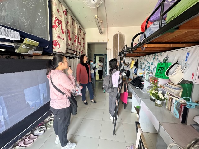 院長丁增武帶領輔導員林世華查看了桂苑社區學生宿舍;院黨委副書記張愛萍帶領輔導員顧盼盼、劉政和柳守志查看了我院竹苑社區和香怡社區學生宿舍。檢查發現,我院學生宿舍大多干凈整潔、物品擺放有序,體現了濃厚的宿舍文化氛圍,反映了學生良好的日常衛生習慣,但也有個別男生宿舍存在物品擺放雜亂、衛生間異味等問題。學院領導針對學生宿舍衛生實際情況,鼓勵同學們保持宿舍干凈整潔,同時也督促相關同學做好整改工作,共同創造良好的學習生活環境。檢查過程中,老師們還與同學們親切交談,詢問大家近期的生活學習狀況,并強調宿舍文明建設在生活學習中的重要意義,指出同學們既要緊抓學習,又要懂得生活。同學們也踴躍地為創建宿舍衛生文明建言獻策,提出了自己的思考和意見。